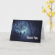 Gracias tarjeta con la imagen de un lobo mágico místico parado en un bosque con una suave nieve cayendo por ahí. Es llamativo que los ojos azules capten tu atención.