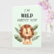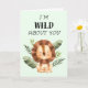 Ilustración de un bebé león adorable con hojas y tipografía vibrante "Loco por ti".