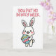 This card shows a simple digital illustration of a white, long-eared bunny-like character 🐰 standing upright against a plain white background. It has tiny black dot eyes, round rosy cheeks, and an open smile with a small tongue showing, giving it a sweet, friendly look that feels like it’s meant for someone close. The character holds an oval egg in a gentle hug, as if cuddling a small gift for a friend or someone it adores. The egg is decorated with flowing, wavy bands of pastel blue, soft pink, and sunny yellow, adding a springtime touch 🌷. Near the top, a short message sits above the character in rounded bubble-style letters, colored bright pink. The text is centered and spaced so it feels like it’s speaking directly to the bunny below, adding a light, teasing warmth to the scene. The bunny’s cheeks are a soft pink, and the patterned egg shows curved stripes in blue, pink, and yellow on the white background.