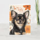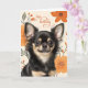Fun birthday wishes to the dog lover who shares life with a Chihuahua and this cute long-haired sweetie has black and tan markings, and sits pretty against a retro floral background in orange hues.