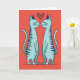 This greeting card shows two tall, stylized cats in teal-blue standing on a warm coral-orange background. They face each other in the center, gently touching noses, with their eyes closed and small, content smiles. A deep red heart sits right above their heads, and it has a dotted texture that makes it feel a bit handmade. The cats also have a light speckled texture, with darker blue-gray stripes and long, curved tails that mirror each other. The simple, balanced layout keeps your attention on their sweet moment of affection and closeness. There isn’t any text on the front, so the image does all the talking and leaves space for your own message ❤️💌. It’s a cozy little design that fits romance or close friendship, especially with a hint of chocolate-day charm 🍫. Hope it helps you share your Valentine’s Day sentiments with someone you care about.
