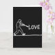 This greeting card features a chalk-on-blackboard style scene with a white-outline baseball player frozen mid-swing, his body angled forward with focused energy as if he’s sending a little affection out into the night 🥰. The background is a deep, solid black, making the rough, grainy white marks feel intimate, like a note left on a classroom board after hours. To the player’s right, the word “LOVE” appears in large, hand-drawn white letters, floating at about chest height as though the bat is about to tap it forward ❤️. The placement creates a gentle story of reaching out, with the swing reading less like aggression and more like a careful, committed gesture. The player’s outline is simple but expressive, with the bat arcing toward the text and the stance suggesting motion and intention. The lettering is slightly uneven and textured, with chalk dust edges that make each letter feel soft against the dark space. Near the bottom, a single thin white horizontal line runs across the card to ground the figure, like a baseline beneath his stride.