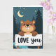 Designed with a sweet nighttime woodland scene, this card features a cute brown beaver or groundhog centered on the front. It has big buck teeth, rosy cheeks, and wide eyes that look straight at you with a friendly, happy expression. The animal holds a bright white sign in both paws, and the words “LOVE you” are written on it in a casual hand-lettered style, with the text placed right in the middle. Behind it, deep teal evergreen shapes form a forest, and a crescent moon and small stars sit high in the dark sky. A calm stream runs along the bottom with soft blue ripples, adding a peaceful feeling. The whole picture feels quiet and caring, like a small moment you want to share with someone close 🥰. It’s a simple way to say you care, whether it’s for a partner or a good friend ❤️