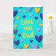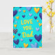 This design shows a teal-blue background filled with floating hearts in different sizes and colors like deep indigo, soft lavender, and bright yellow. The hearts have a slight shadow that makes them look a bit like balloons drifting across the page. In the center, the words “LOVE YOU, Dad” stand out in warm yellow lettering. “LOVE YOU” is in rounded uppercase letters, while “Dad” is written in a smoother, cursive-style word just beneath it. One heart near the middle is dark purple with small yellow dots, adding a sweet little detail that catches your eye. The whole scene feels cheerful and caring, like a simple reminder that you’re thinking of him 🥰. It’s a meaningful card to give when you want to say thank you and show steady, everyday love ❤️. Hope it helps you share your Valentine’s Day feelings with someone special.