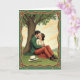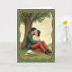 This St. Patrick's Day card shows a couple sharing a gentle kiss on deep green grass beneath a wide, mature tree, with an ornate art nouveau border wrapping the scene. Earthy greens and warm browns shape the frame, and small shamrock motifs tucked into the corners add a quiet ☘️ touch. The man wears a forest-green jacket with rust-toned trousers, leaning in with an easy, protective hold that reads like steady devotion. Beside him, the woman in a cream blouse and flowing terracotta skirt tilts toward him, her relaxed posture and closed eyes suggesting calm trust and closeness 💚. Above the illustration, St. Patrick’s Day text sits near the top in a soft green, centered so it feels like it’s floating over the treetop canopy. The sky behind them is brushed with pale, impressionistic clouds, and the light looks diffused like a mild afternoon. Near their feet, a straw hat and a walking cane rest on the grass while the tree’s textured bark rises behind them, dark and ridged against the softer greens. Share St. Patrick's Day sentiments with someone you care about, and let the border’s curling lines and shamrock details lead the eye back to the couple under the spreading branches.