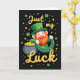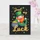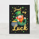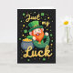This greeting card features a cheerful leprechaun centered in a tall layout, smiling wide with rosy cheeks and a full orange beard that feels like a friendly wink to the viewer 💚. He wears a classic green top hat with a gold buckle, and he holds a rich green horseshoe close to his chest as if he’s proudly showing it off to a pal. To his left sits a dark charcoal pot overflowing with gleaming gold coins, adding a cozy sense of shared good fortune. The background is deep black, making the greens and golds stand out sharply, while small gold coins and green shamrocks drift around like confetti ☘️. The phrase “Just my Luck” appears in gold at both the top and bottom, with a soft glow that frames the character without crowding him. Gentle shading and gradients give the hat, beard, horseshoe, and coins a rounded, almost touchable look. Tiny shamrocks and scattered coins dot the black space around the leprechaun, with the gold lettering hovering above and below him.