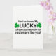 This card keeps things simple on a bright white background, where black sans-serif text sits centered like a neat note meant just for you. The message reads, “I feel so incredibly LUCKY to have such wonderful customers like you!” with the words arranged in a tidy stacked layout. “LUCKY” appears in large uppercase letters, drawing the eye the way a fond glance holds attention in a close friendship. Two emerald green three-leaf shamrocks sit on either side of “LUCKY,” like a small matching pair that frames the word with a gentle, affectionate touch 💚. Aside from those green accents, everything stays black and white, making the clovers feel like a quiet little gift of color ☘️. The spacing is open and uncluttered, giving the message room to breathe without any extra scenery or borders. The green shamrocks are positioned level with the center of the big “LUCKY,” one to the left and one to the right, with their stems angled slightly inward.