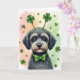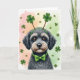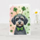 Designed with a small fluffy terrier-like dog placed front and center, meeting you with a steady, affectionate gaze that feels like a quiet hello from a close friend 💚. Its textured coat is deep charcoal with sandy touches around the snout, and its soulful brown eyes stand out against the darker fur. A bright green headband sits on top with two four-leaf clovers rising like little antennae, and a matching green bow tie wraps neatly around its neck ☘️. Behind the pup, a soft painted background shifts from warm peach on the left to fresh spring green on the right, like early evening light drifting across a room. Small shamrocks float across the backdrop, scattered in a way that frames the dog and draws your eye back to its face. The St. Patrick’s Day greeting appears near the top in green lettering, balanced so it doesn’t crowd the dog’s ears and clover headband. The lower area stays lighter and open, with the shamrocks and color wash fading gently toward the bottom edge.