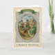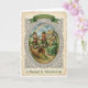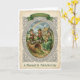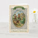 This design shows an aged parchment-style background with softly worn edges, centered around an oval scene bordered by interlaced knot patterns and scattered three-leaf clovers. Inside the oval, two small, cheerful men in green suits and pointed hats sit close together on mossy rocks, their white beards flowing as they draw violins in matching arcs, glancing toward each other like old friends. Beside them, a young woman in a flowing emerald dress and bonnet leans toward the music as she plucks a golden harp, her calm expression adding a gentle, companionable warmth. Behind the trio sits a straw-roofed cottage tucked into rolling green hills, with a faint rainbow curving across the sky like a soft promise after rain 🌷. In the foreground, a wicker horn-shaped basket spills shiny gold discs and clover sprigs onto the ground, the scattered pieces catching the light. A ribbon banner curves along the top with a short phrase in dark lettering, while a seasonal greeting appears along the bottom margin in smaller green text 🐇. The border’s knotwork loops tightly around the oval, with tiny clovers tucked into the corners and along the frame.