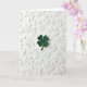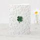 This design shows a single emerald green shamrock centered on a wide white background, drawing your eye right away with its lightly sparkly, felt-like texture. Around it, the paper is filled with many faint shamrock and clover shapes pressed into the surface in different sizes and angles, like a quiet crowd gathered close. The soft lighting makes tiny shadows in the raised and sunken shapes, giving the scene depth while keeping everything calm and airy. The lone green clover feels like a small token someone picked out for a dear friend, standing out with a gentle kind of attention 💚. A small “Happy St. Patrick’s Day” line sits near the top in light green, leaving plenty of open space so the centerpiece can breathe. Near the bottom, a short sign-off in matching green is set smaller, as if tucked in like a private note between two people ☘️. The background clovers remain white-on-white, with their edges only visible where the light grazes the embossed texture.
