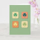This card features four stylized shamrocks arranged in a neat 2x2 grid on a muted sage green background, with each clover sitting inside a rounded square tile. The tiles alternate between creamy beige and warm peach, and a soft shadow under each one gives a slight lift, like they’re gently floating side by side. The shamrocks themselves shift from fresh spring green to deeper teal, with one in a soft sunny yellow, creating a calm mix of cool and warm tones 💚. The careful spacing and matching shapes make the design feel like a quiet shared moment, as if the clovers are paired up in friendly conversation ☘️. Any greeting text would sit best centered beneath the grid in a light cream or pale peach, keeping the layout balanced and easy to read. If a shorter line is added, it could also appear in small type at the top, aligned to the middle in a darker teal to echo the leaves. Each rounded square has smooth corners and a gentle, diffused shadow that stays close to the edges.
