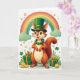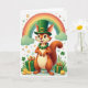Designed with a friendly St. Patrick’s Day scene, the card centers on an anthropomorphic squirrel standing upright in soft light, its orange-brown fur shaded to look touchable and warm. It wears an emerald green top hat with a gold buckle and a chunky green beaded necklace, and its wide smile and bright brown eyes feel like it’s sharing a private joke with someone close 💚. A tall rainbow arches overhead, spreading classic bands of color across a white background, with rounded green clouds tucked at the rainbow’s base. Near the bottom, shamrocks mix with small pastel flowers, and the arrangement feels like a sweet little spot where friends might linger shoulder to shoulder ☘️. Green gift boxes with gold ribbons sit among scattered gold coins, hinting at a lucky treasure without crowding the scene. Any greeting text would sit neatly in the open white space above or beside the squirrel, and it would look best in a medium green that matches the hat and shamrocks. Share St. Patrick’s Day sentiments with someone you care about.