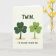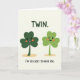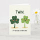 This greeting card shows two smiling, human-like shamrocks centered on a pale cream background, facing forward with a cozy, close-together feel 💚. Above them, the word “TWIN.” appears in dark green, all-caps lettering, set near the top and spaced to stand out. The shamrock on the left is a deeper forest green with wide oval eyes, an open smile with a tiny touch of pink inside the mouth, and coral-orange blush marks that make it look like it’s grinning at its partner. On the right, a lighter lime-green shamrock mirrors the pose with matching blush and a smaller, closed smile, as if sharing a quiet inside joke ☘️. Their slightly different shades and expressions make them feel like best friends who match without being exactly the same. Near the bottom, “I’M SO LUCKY TO HAVE YOU.” is printed in the same dark green, centered beneath the pair to frame them like a gentle note. Each shamrock sits on its own warm beige oval base, like little patches of ground under their stems.