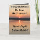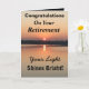 Expresa tus deseos para una feliz jubilación en una tarjeta de puesta de sol inspiradora con el versículo “Tu Luz Brilla Fuerte”. El diseño minimalista es moderno con colores atrevidos de oro y negro que muestran agua brillante y un lago tranquilo. ¡Felicidades por muchos años felices!