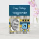Fondo rústico de madera gris falsa. Edad de la muestra: 21 hoy tarjeta de felicitación de cumpleaños para él. Añadir foto, nombre, edad y mensaje. Diseñado en azul y oro. 21 de hoy, o cambiar la edad a la adecuada. Se utiliza un filtro que cambia automáticamente la foto de color a blanco y negro.
