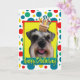 Celebre un cumpleaños con esta tarjeta de felicitación caprichosa del perro del Schnauzer. ¡Con una magdalena equilibrada en ella es la cabeza, este diseño está seguro de traer una sonrisa y ríe nerviosamente! El BTW, este diseño tiene varias versiones, con diversos colores de fondo. Hay también una invitación a una versión del fiesta.