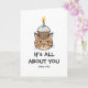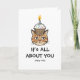 Celebra su cumpleaños con esta divertida tarjeta que presenta a un gato atigrado gruñón que claramente no está impresionado. El gato lleva a regañadientes una tarta de cumpleaños completa con sprinkles y una vela encendida en la cabeza. El texto sarcástico dice: "Es TODO SOBRE TI / solo hoy".
