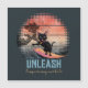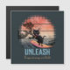 Tarjeta magnética para gatos ondulantes: gato negro surfeando sobre una ola, con el sol en tonos rosa y naranja, creando una escena caprichosa y surrealista.