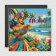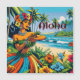 Bonito estilo libro de historietas estilo ai art. La bailarina de hula en la playa rodeada de bonito Hibiscus, flores tropicales y palmeras con fondo oceánico.