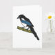Dibujo de una Magpie con el distintivo flash azul de color, y las marcas blancas - encaramadas en una rama. Un pájaro astuto con mucho folclore refiriéndose a él. Un diseño divertido para los fans de la revista.