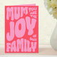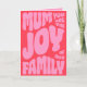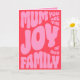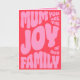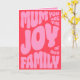 Esta Tarjeta Del Día De La Madre tiene 'Mamá Eres La Alegría De Nuestra Familia' en rosa sobre un fondo rojo. Una tarjeta elegante, moderna, audaz y trendy para mostrarle a tu mamá cuánto la amas. Feliz Día De La Madre a todas las madres que están allí.