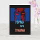 Comunícate con alguien que necesite tu comprensión y apoyo. Un mensaje sobrio pero positivo es evocado por este diseño semi-abstracto en tonos azules oscuros, rojos y negros. La gráfica representa a hombres jóvenes con la palabra "Guerra" en sus camisetas como "Cómo afrontar el trauma", que es uno de los desafíos más extraordinarios y brutales (físicos o emocionales) que los seres humanos pueden llegar a enfrentar. Sin embargo, para aquellos que sufren de trauma, sea cual sea su origen, la gráfica también tiene una cualidad alentadora: no estás solo y puedes afrontarlo. Un fondo azul calmante con una versión más pequeña de la misma gráfica está en la parte delantera interior de la tarjeta.