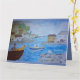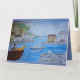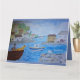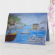 Puerto Quirky con un hombre y un perro feliz en un bote, una gaviota y edificios coloridos. Añadir texto a cualquier área/ lado de la tarjeta. Personalizable completo.
