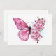 Arreglo floral de mariposa rosa con flores japonesas de cerezo rosadas sobre fondo blanco.
