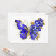 Joyería, azul, zafiro, mariposa de flor brillante con ala decorada con flores azules preciosas con hojas de oro sobre fondo blanco.