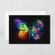 Arcoiris, mariposa monarca luminosa, pintada de forma artística con ramo de iridiscente, rosas brillantes y luminiscentes sobre fondo negro. Mariposa arcoiris.