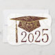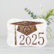 Diseños florales sobre el tapón de graduación, antecedentes y año. Gorra de graduación de marrón sobre un fondo blanco. La parte trasera tiene un fondo marrón con letras doradas para los anuncios de graduación.
