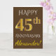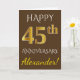 Este diseño de tarjeta de felicitación de aniversario de boda simple y personalizado presenta el mensaje "FELIZ 45º ANIVERSARIO", con el "45º" teniendo una apariencia similar al oro. La parte delantera también presenta un nombre personalizado y un fondo de color marrón. El interior presenta un mensaje de felicitación de aniversario de boda personalizado. Podría darse a un esposo o una esposa en celebración del cuadragésimo quinto aniversario de boda de la pareja.