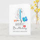 Una tarjeta de cumpleaños feliz para médicas con un abrigo blanco, globos y diseño de corazón > puede personalizarla con su nombre médica