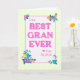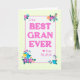 Una tarjeta del Día de la Madre para el mejor GRAN de la historia. El diseño tiene un borde de gingham de color amarillo alrededor de las palabras "A la mejor GRAN de todos nosotros", con letras de color rosa magenta sobre un fondo blanco con texturas ligeras. En las esquinas hay un gran número de flores multicolores y un pequeño corazón rosa magenta. El mensaje interno se puede personalizar o borrar si lo desea.