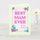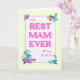 Una tarjeta del Día de la Madre para el mejor MAM de la historia. El diseño tiene un borde de gingham amarillo en torno a las palabras: "Al mejor MAM de todos nosotros, con letras color rosa magenta sobre un fondo blanco con texturas leves. En las esquinas hay un gran número de flores multicolores y un pequeño corazón rosa magenta. El mensaje interno se puede personalizar o borrar si lo desea.