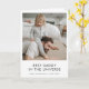 Fotografía simple y elegante de personalizado "Mejor papá en el universo". Tarjeta feliz Día del Padre con tipografía minimalista moderna y un sencillo borde blanco. ¡La foto y el texto se pueden personalizar fácilmente para un diseño tan único como tu papá especial! La imagen que se muestra es para fines de ilustracion y sólo se sustituye por la suya. La imagen de marcador de posición es de un padre joven con su hija sentada sobre los hombros en una alfombra rústica en un escandaloso dormitorio de diseño minimalista. Están jugando y divirtiéndose.