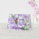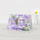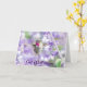 Ponte bien pronto con una tarjeta con un colibrí de anna con plumas rosadas de garganta volando en flores moradas. Hermosa tarjeta para los amantes del colibrí, el jardín y la naturaleza. Foto tomada en Arcadia, California.