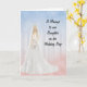 Mensaje a la hija en su tarjeta del día de la boda, de sus padres. El diseño es una hermosa novia en su vestido con un velo y flores, con un fondo de maderas mágicas. Se pueden cambiar todas las palabras de la tarjeta. Gracias a los recortes de diseño y a la tela creativa por algunos de los elementos del diseño.