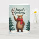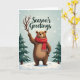 This cute winter scene features a happy brown bear wearing a cozy red scarf, standing on a snowy hill with two pine trees beside it. The bear looks super cheerful with its rosy cheeks and big smile, making it so adorable. In the sky, there are delicate white snowflakes falling, creating a peaceful winter vibe. The bear is holding a twig, adding a fun touch to the festive setting. The words "Season's Greetings" are written beautifully above the bear, making it a perfect holiday card to spread cheer and warmth. 🎅🏼🎄🎁