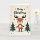 On each side of the reindeer, there are two matching green Christmas trees with golden stars, red ornaments, and twinkling lights. They add to the traditional feel of the scene. Above them, the words "Merry Christmas" are written in fancy black cursive, surrounded by grey, green, and red snowflakes scattered on a cream-colored background.