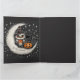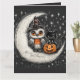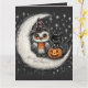 Un búho lindo con ojos naranjas brillantes se sienta en la luna junto a una calabaza y un gato negro extravagante.