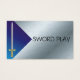 Tarjeta metálica azul y plateado y Espada medieval con plantilla de tarjeta de visita de gradiente azul. Las joyas reales y la espada de oro se adaptan a un rey. Personalizable, fuente, colores de fondo y más todo en línea.