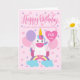 Un adorable unicornio sentado en un arcoiris rodeado de globos y confeti. La parte superior de la tarjeta tiene las letras de la mano 'Cumpleaños feliz', mientras que el globo con forma de corazón tiene las palabras con letras de la mano 'uno hoy'. ¡La tarjeta perfecta para el primer cumpleaños de tu dulce nieta!