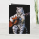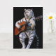 A tasteful and understated greeting card showcasing a calm white tiger illuminated against darkness as it plays an acoustic guitar. Perfect for sending thoughtful notes with a touch of artistic sophistication.