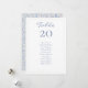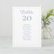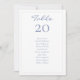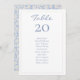 Estas tarjetas de número de mesa y asignación de asientos para invitados de boda chic y elegantes presentan un número de mesa editable y una lista de asignación de asientos para invitados. El diseño incluye un conjunto contemporáneo de fuentes en un azul polvoriento chic sobre un fondo blanco, mientras que la parte posterior luce un hermoso patrón floral azul.