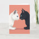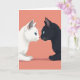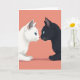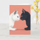 This design shows two cats facing each other in a quiet, close moment 🥰. On the left is a white cat with bright blue eyes, and on the right is a black cat with teal-green eyes. Their heads are lined up in profile, noses almost touching, as if they’re about to nuzzle. The background is a warm coral color, which makes the light and dark fur stand out clearly. Fine shading gives their faces a gentle, soft look, and their white whiskers are thin and easy to notice. There isn’t any text on the front, so the picture carries the whole message on its own. It feels meaningful to give because it shows closeness and care, even when two hearts look different ❤️. Hope it helps you share Valentine’s Day sentiments with someone special.
