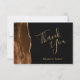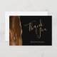 Esta elegante y moderna tarjeta de agradecimiento boda presenta una barra húmeda marrón mocha bordeada por un falso purpurina de oro. El texto del personalizable combina las palabras "Gracias" en escritura a mano de color dorado y los nombres de la novia y el novio en letra cursiva en un fondo negro. Agregue su propio mensaje personal al reverso en blanco.