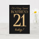Una tarjeta de cumpleaños número 21 de moda para un 'Novio muy especial', con un número 21 compuesto por números de efecto oro y la palabra 'Novio', en efecto oro, en un fondo negro. El mensaje interno, que puedes cambiar si lo deseas, es "Feliz Cumpleaños".