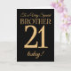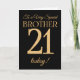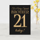 Una tarjeta de cumpleaños número 21 de moda para un 'Hermano muy especial', con un número 21 compuesto de números con efecto oro y la palabra 'Hermano', con efecto oro, en un fondo negro. El mensaje interno, que puedes cambiar si lo deseas, es "Feliz Cumpleaños".
