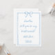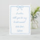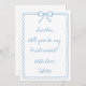 Una manera elegante de preguntar, ¿Serás mi dama de honor? Esta tarjeta de propuesta inspirada en Algo Azul presenta un delicado arco dibujado a mano, bordes de vieiras y un suave guion azul para un toque de elegancia intemporal. Perfecto para bodas clásicos, costeros o de moda vintage, este diseño es sin esfuerzo femenino y refinado. Personalice los nombres de sus damas de honor por un momento tan sincero que apreciarán.